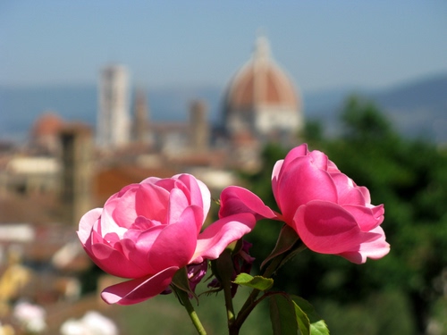 Il Duomo di Firenze incornicia le rose dell'omonimo giardino situato al Piazzale Michelangelo.