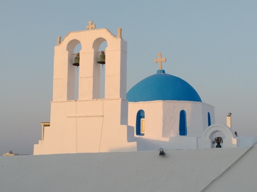 ho scattato questa foto rapita dal gioco di colori tra i raggi del sole al tramonto e l'inconfondibile architettura bianca greca.