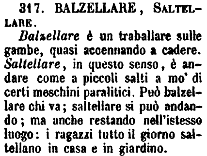 | Balzellare, Saltellare - Balzellare è un traballare sulle gambe, quasi accennando a cadere. Saltellare, in questo senso, è andare come a piccoli salti a mo' di certi meschini paralitici. Può balzellare chi va; saltellare si può andando; ma anche restando nell'istesso luogo: i ragazzi tutto il giorno saltellano in casa e in giardino. [immagine] |