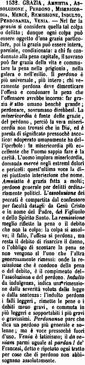 | Amnistia, Grazia, Perdono, Assoluzione, Indulto - L'Amnistia è cosa tutta politica e si fa dal capo del Governo, il quale dichiara, per via di essa, che dimentica tutto ciò che è stato fatto, o contro la persona sua, o contro l'ordine pubblico. La Grazia è l'atto con cui il capo dello Stato libera dalla pena, o da una parte della pena, colui che fu condannato. L'Assoluzione è quando un tribunale dichiara che uno, accusato o processato per alcun delitto, è innocente, e però lo manda libero; per i cattolici è l'atto e le parole con le quali il confessore proscioglie il penitente dai peccati che gli ha confessato. Perdono è il rimettere spontaneamente l'offesa fattaci, il fallo commesso; ma comprende in sè l'idea di tutte le altre voci notate. L'Indulto è atto d'indulgenza in rimettere alcuna cosa della legge, dell'obbligo; ha senso ecclesiastico; e si usa specialmente parlando del digiuno quaresimale. [immagine] |