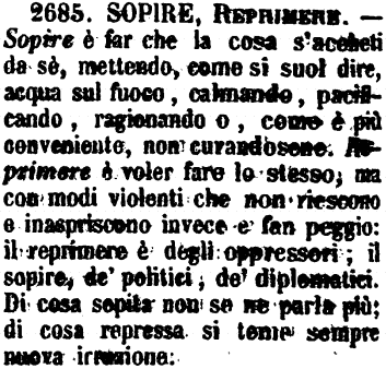 Sopire, Reprimere - Sopire è far che la cosa s'accheti da sè, mettendo, come si suol dire, acqua sul fuoco, calmando, pacificando, ragionando o, come è più conveniente, non curandosene. Reprimere è voler fare lo stesso, ma con modi violenti che non riescono e inaspriscono invece e fan peggio: il reprimere è degli oppressori; il sopire, de' politici, de' diplomatici. Di cosa sopita non se ne parla più; di cosa repressa si teme sempre nuova irruzione. [immagine]